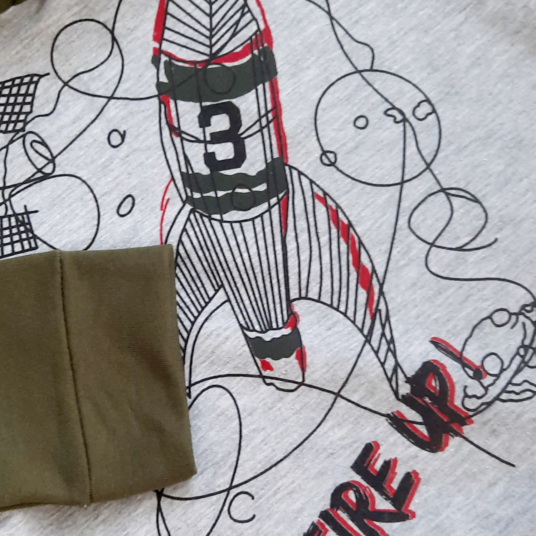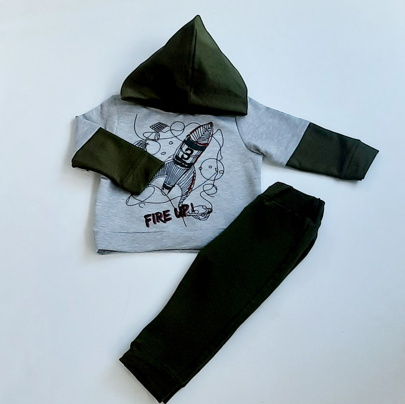 In great winter colours, this khaki & grey tracksuit is ideal for days to park & ruining around. The hoodie top has a Fire Up rocket flying around the planets. The sweatpants is soft cotton with a comfy wide band at the waist.