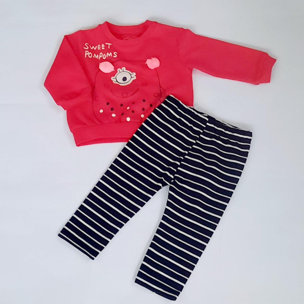 With lots of colour, the hot pink sweatshirt has fun pom poms ....matched with funky black & white stripe leggings.