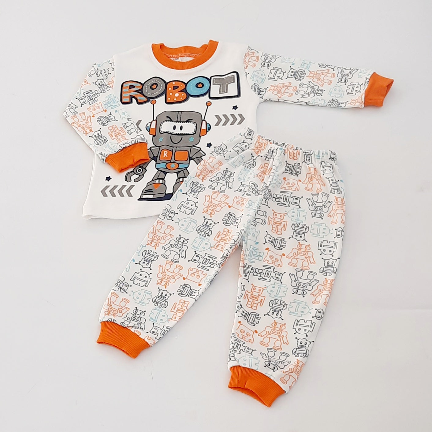 Every little boy will love these cotton pjs in a gorgeous orange with fun robots.