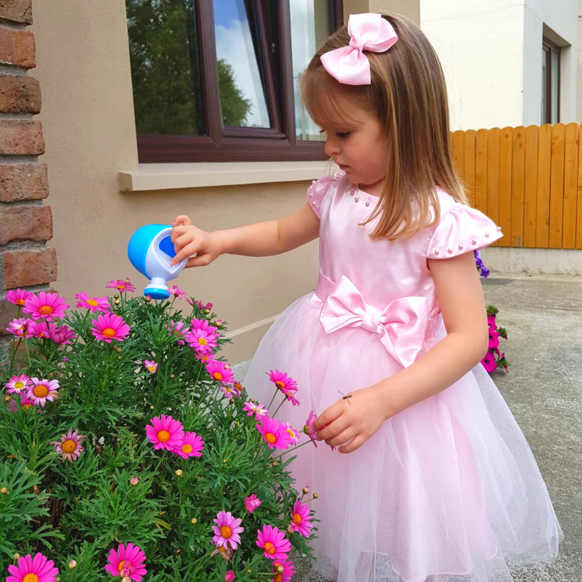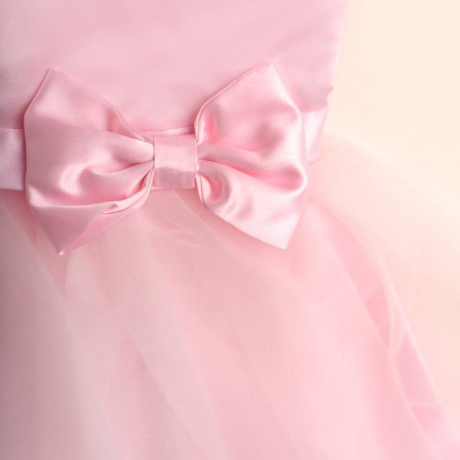 We love the soft pink hues and the volume in the skirt . The fitted bodice is in pink satin, with a round neckline and edged with delicate pink pearls. The full layered skirt is netted and clinched at the waist with ribbon belt and beautiful stiff bow.